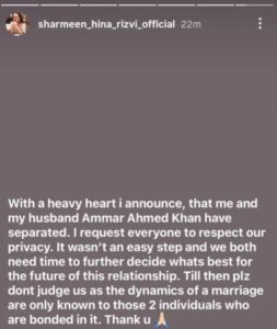 The actress wrote in an Instagram story, “with a heavy heart, I announce that my husband Ammar Ahmed Khan and I have separated. I request everyone to respect our privacy.