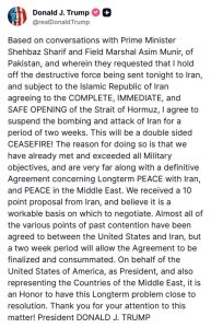 Trump said the step came after talks with Shehbaz Sharif and Asim Munir, who called for restraint from all sides. He described the plan as a “two-sided” ceasefire, which depends on Iran ensuring the full, immediate, and safe reopening of the vital shipping route.